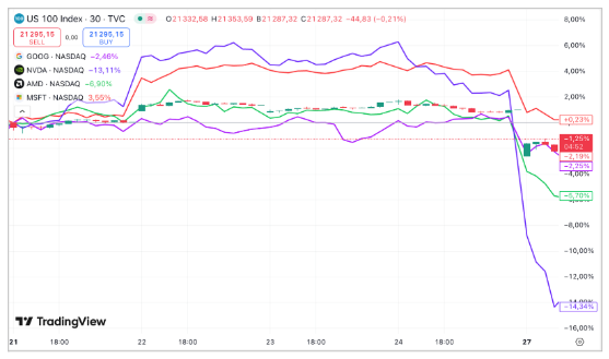 La Bourse n’était pas encore ouverte, que la plupart des entreprises composant le Nasdaq-100 (qui lui-même baissait de -3%), l’indice tech américain, commençaient à chuter.