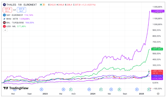 Si tu prends les 5 plus grosses entreprises de défense européennes (incluant toujours les françaises Thalès et Safran, mais en ajoutant l’entreprise britannique Bae System, le géant des munitions allemand Rheinmetall, et Leonardo, le géant italien de l’aéronautique)...