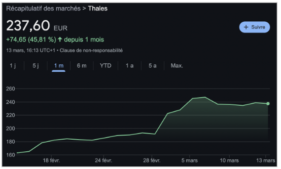 La preuve, à peine l’allocution du président entamée, que l’entreprise française de la défense, Thalès, prenait déjà +7% dans la journée…