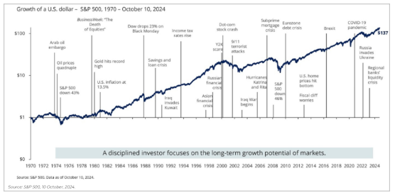 La preuve, depuis 1970 où, même après les pires crises, le S&P 500 finit toujours par grimper :